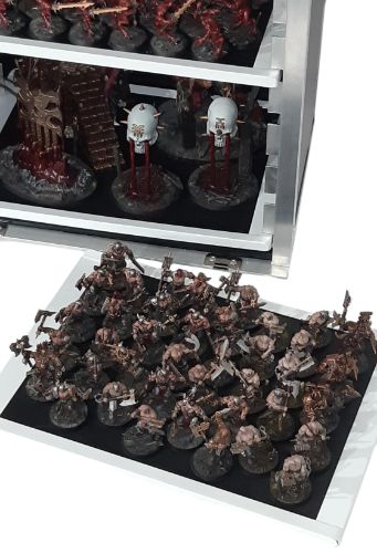 Each shelf has a 0.4mm sheet metal layer for your magnetized bases to stick to with a rubberized coating to prevent your miniatures sliding around during transport.